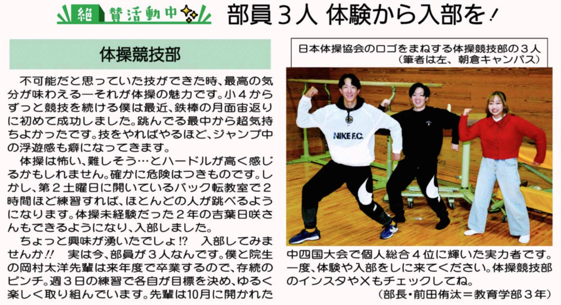 記事では,体操競技部 部長であり本学部3年生の前田侑汰さんのコメントが紹介されています。