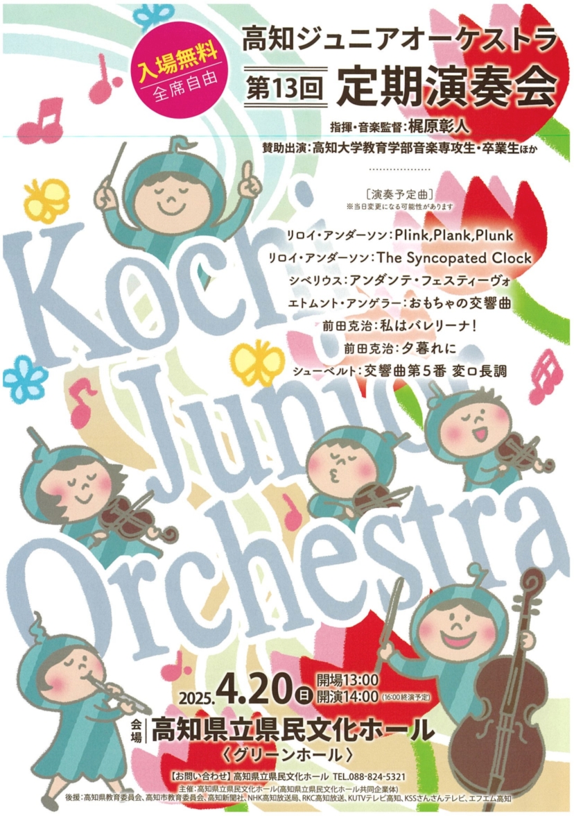 高知ジュニアオーケストラでは,高知県立県民文化ホールを拠点に,小学生から高校生まで総勢30名近くがプロの音楽家のもと練習に取り組み,地域に根差した活動を行っています。