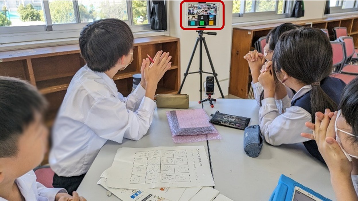 そこで本研究では,附属小学校が高知県内の2校(A校・B校)とそれぞれ2回ずつ,計4回の国語科の合同授業を行い,そのうち3回は遠隔会議システムを用いた遠隔授業,1回は対面授業として実施した上で,それぞれの授業前後における児童の気分の変容を調査しました。合同授業では,児童が有するタブレットPCや大型ディスプレイ(電子黒板)を使用して接続した上で,ロイロノート(Loilo社)を用いた資料共有や,Zoom(Zoom Communications Inc.)のブレイクアウトルームを用いたグループ活動等を実施しました。