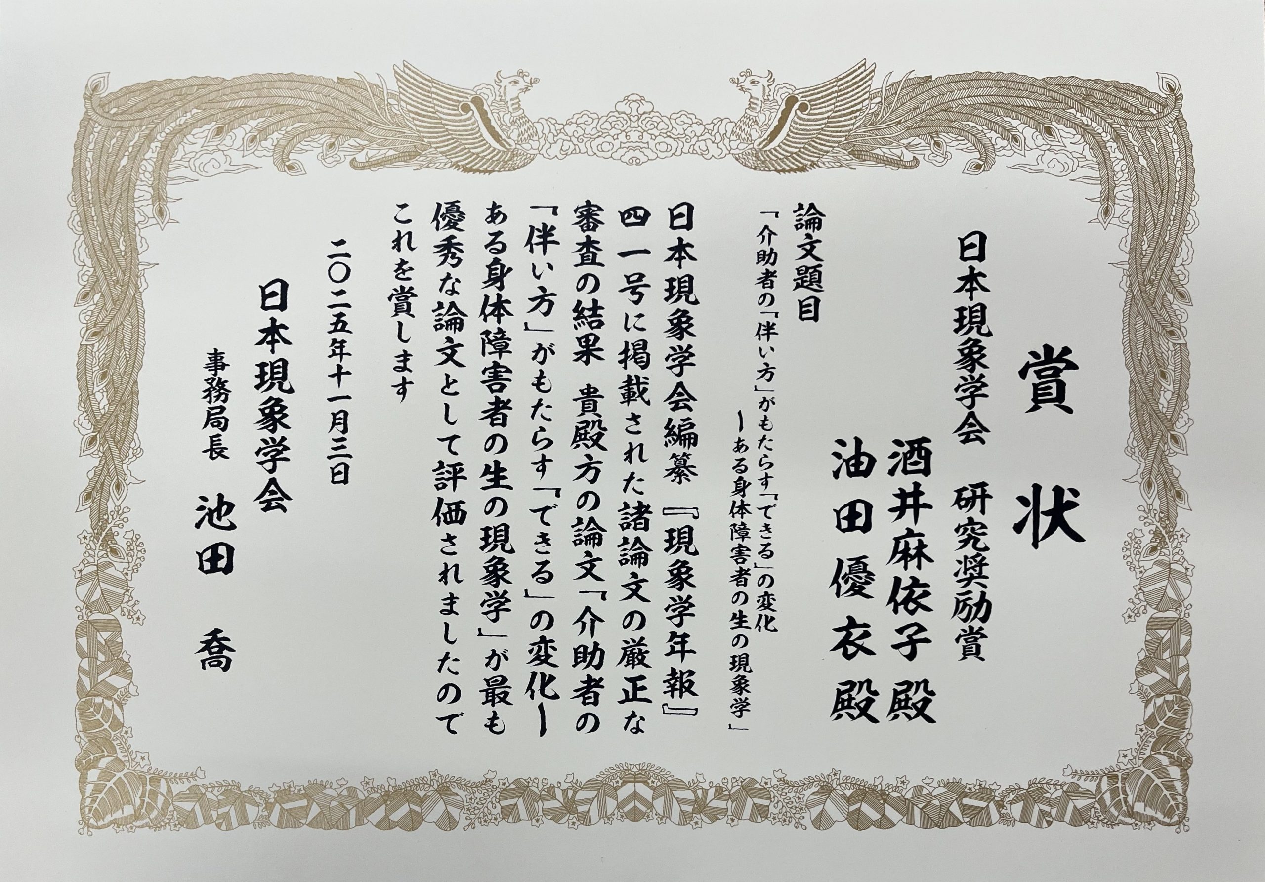 酒井准教授と油田さんが執筆し「現象学年報」第41号に掲載された論文『介助者の「伴い方」がもたらす「できる」の変化――ある身体障害者の生の現象学』は,共著者である障害の当事者へのインタビューを通して経験を現象学的に記述し,共著者とともにその分析を行なったもので,その研究手法の独自性が高く評価され,本賞を受賞しました。