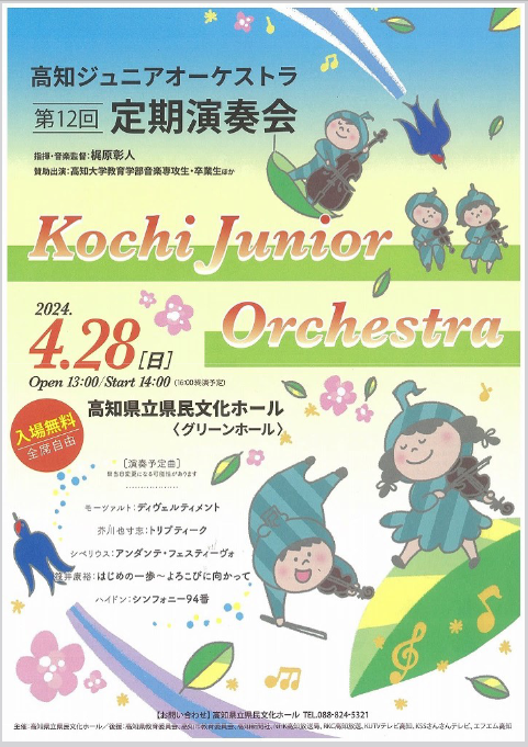 高知ジュニアオーケストラでは,高知県立県民文化ホールを拠点に,小学生から高校生まで総勢30名近くがプロの音楽家のもと練習に取り組み,地域に根差した活動を行っています。