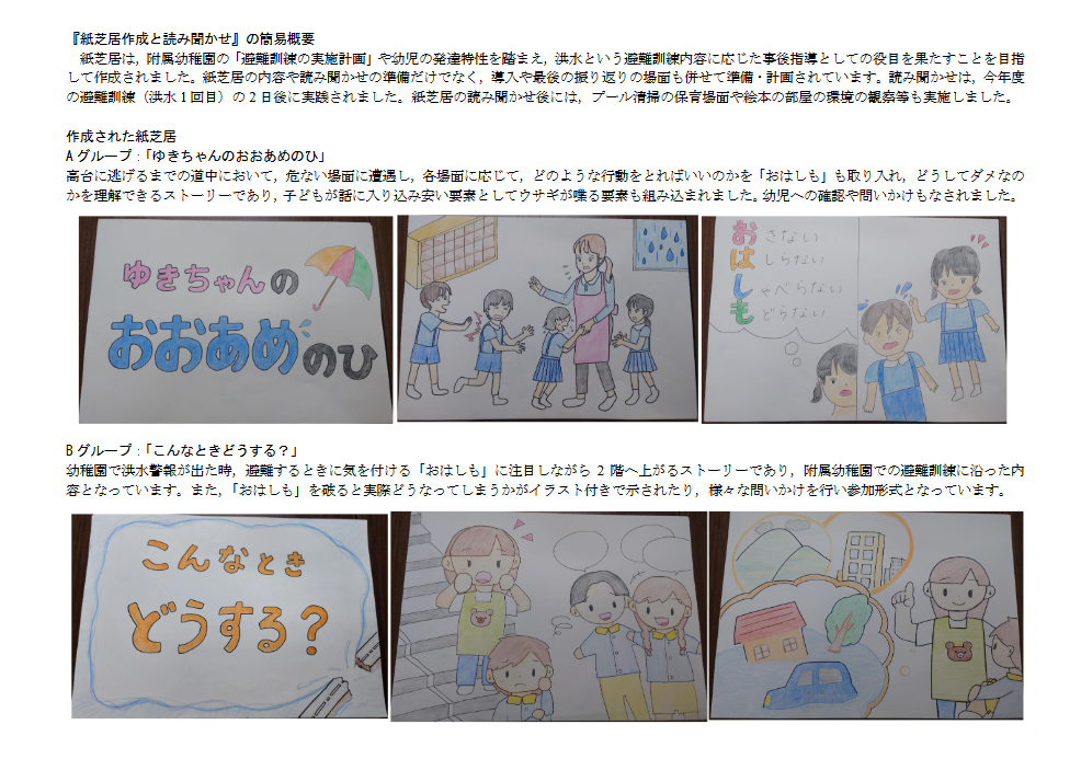 6月6日(木)に,本学部の野中陽一朗准教授(教育心理学)が担当する「子どもの理解と援助(演習)」において,附属幼稚園の年長さんを対象とした「洪水」の避難訓練に関する紙芝居の作成と読み聞かせがおこなわれました。 この取り組みは,梅雨を迎えるにあたって実施された洪水の避難訓練の事後指導として位置づけられたものです。