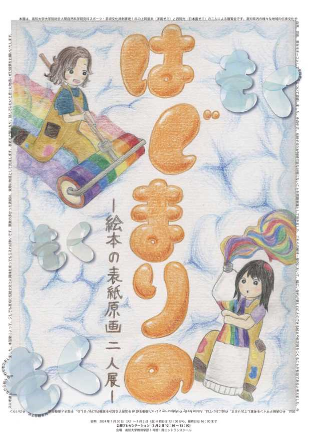 7月30日(火)より,教育学部の卒業生で,現在スポーツ・芸術文化共創専攻1年生の2名(上岡亜未さん,西岡光さん)による絵本表紙デザインに関する展覧会が,高知大学教育学部1号館1階エントランス(朝倉キャンパス)で開かれます。詳しくはスポーツ・芸術文化共創専攻Webサイト(下記URL)よりご覧ください。
