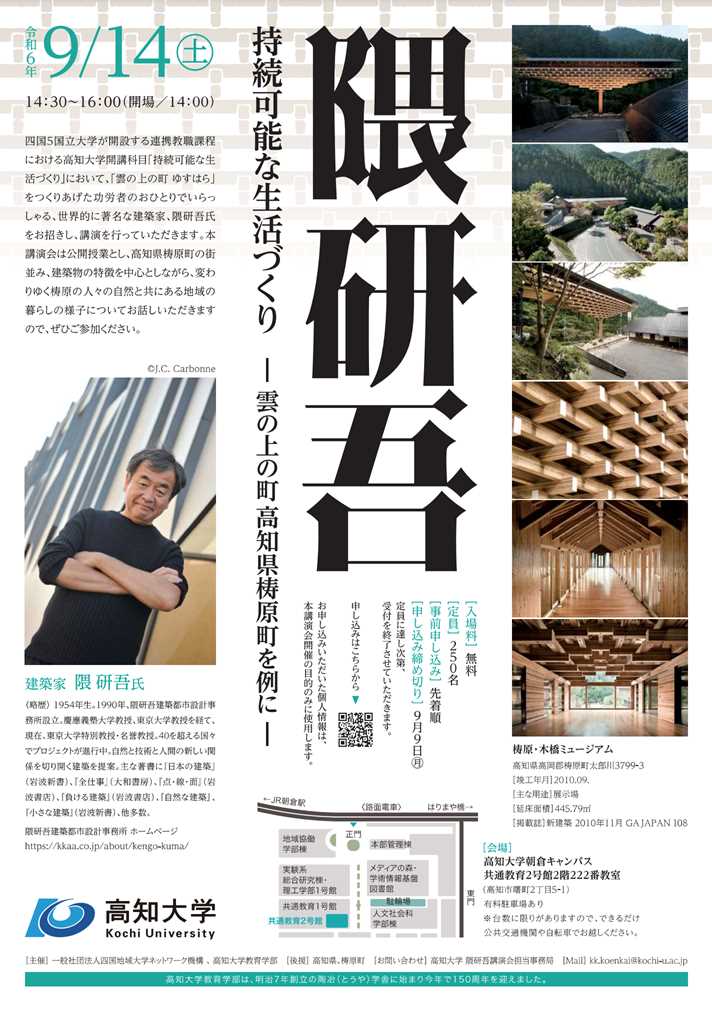 9月14日(土)に,朝倉キャンパスにおいて,「雲の上の町 ゆすはら」をつくりあげた功労者のおひとりでいらっしゃる,世界的に著名な建築家 隈研吾氏をお招きし,講演を行っていただきます。
